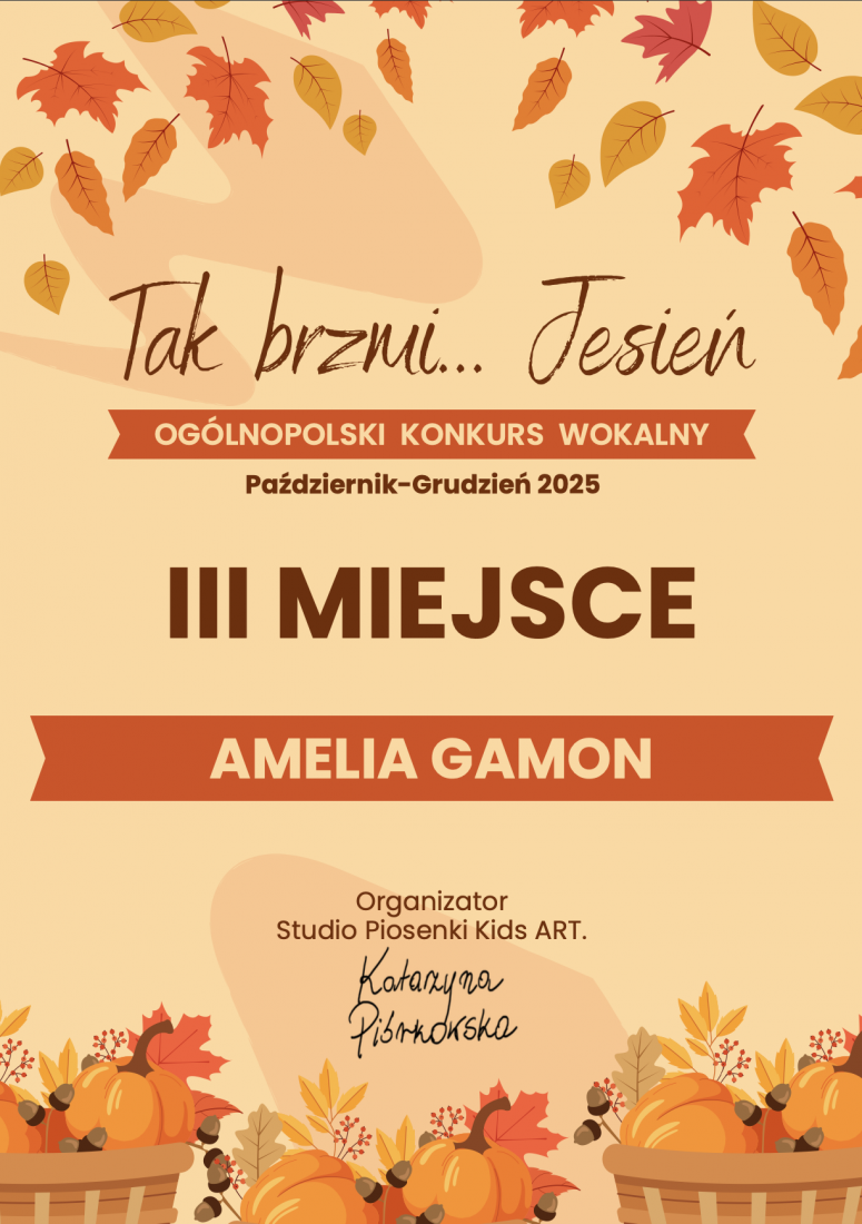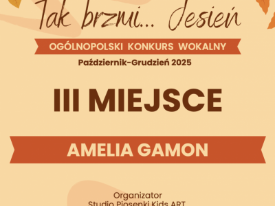 - Amelia Gamon zdobyła III miejsce na Ogólnopolskim Konkursie Wokalnym „Tak brzmi jesień”. Amelię przygotowała Magdalena Wydriński.