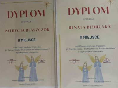 Nasze uczennice Renata Bedrunka i Patrycja Błaszczok, występujące jako duet wokalno-instrumentalny, zdobyły II miejsce podczas XXI Przeglądu Kolęd i Pastorałek „Święta z kolędą – Weihnachten mit Weihnachtsliedern”, prezentując repertuar w języku polskim i niemieckim.