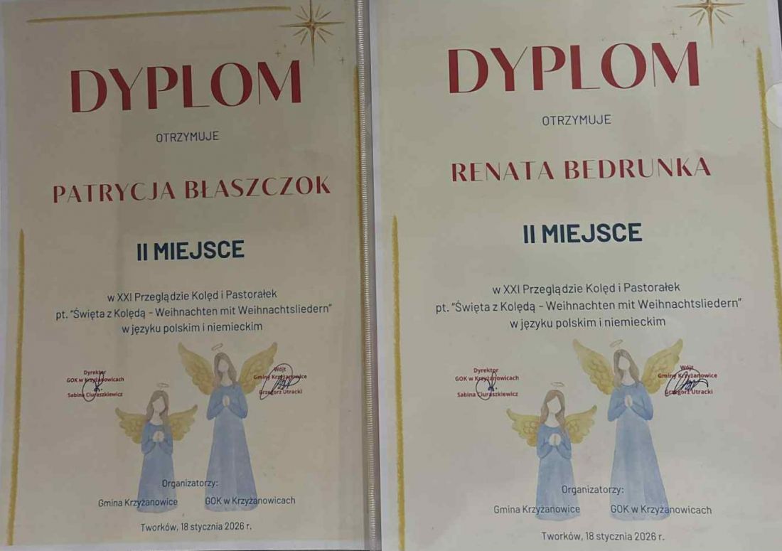 Nasze uczennice Renata Bedrunka i Patrycja Błaszczok, występujące jako duet wokalno-instrumentalny, zdobyły II miejsce podczas XXI Przeglądu Kolęd i Pastorałek „Święta z kolędą – Weihnachten mit Weihnachtsliedern”, prezentując repertuar w języku polskim i niemieckim.