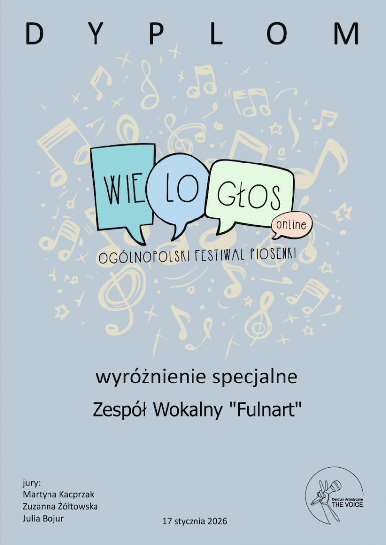 Zespół wokalny „Fulnart” otrzymał wyróżnienie specjalne podczas Ogólnopolskiego Festiwalu Piosenki „Wielogłos”, organizowanego przez Centrum Artystyczne The Voice.